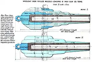 While strong, the multiple coils were considered too expensive for construction in quantity. From 1867 guns were built on the simplified and hence cheaper "Fraser" system involving fewer but larger coils similar to the 10-inch (254-mm) Mk II gun. The guns were not considered a success, with the rifling twist of 1 in 100 increasing to 1 in 50 considered insufficient for accuracy, and guns were retubed in 11-inch (279-mm) calibre when their bores wore out.[4]