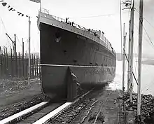 The ship was launched on 7 June 1906, eight weeks later than planned due to labour strikes and eight months after Lord Inverclyde's death. Princess Louise was invited to name the ship but could not attend, so the honour fell to Inverclyde's widow Mary.[36][1] The launch was attended by 600 invited guests and thousands of spectators.[37] One thousand tons of drag chains were attached to the hull by temporary rings to slow it once it entered the water. On launch the propellers were fitted, but on later launches propellers would be fitted in dry dock as they could be damaged by colliding with another object on launch.[38] The wooden supporting structure was held back by cables so that once the ship entered the water it would slip forward out of its support. Six tugs were on hand to capture the hull and move it to the fitting out berth.[39]