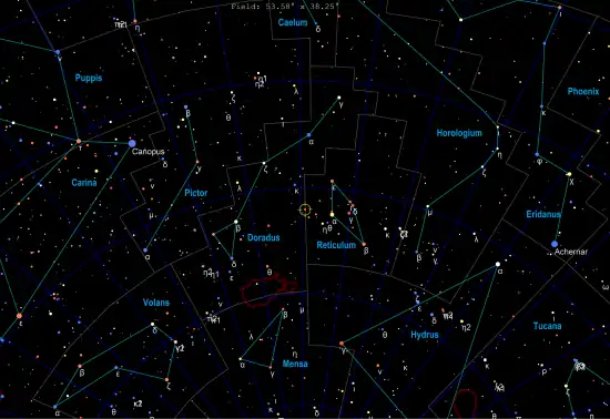 | R Doradus figures almost at the western limit of Dorado, next to Reticulum (map to be held, as standard, upwards, with south horizon in front of viewer). Like Alpha Reticulum, which outshines it, it is a little south of a line between the bright stars Canopus and Achernar, as is the narrow kite-shaped asterism of Reticulum. |