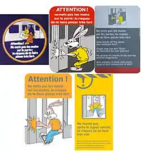 The rabbit of Paris Métro (French: Lapin du métro parisien), also known as Serge the Rabbit, is a fictional character that has been used as a mascot by the RATP Group since the 1970s to promote child safety in the Paris Métro.[1][2] The rabbit is depicted on stickers warning passengers against placing their fingers in the doors when they are closing, accompanied by messages in different languages in addition to French. Its design has changed over time.[3][4]