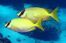 Rabbitfishes or spinefoots are perciform fishes in the family Siganidae. The 29 species are in a single genus, Siganus.[4] In some now obsolete classifications, the species having prominent face stripes—colloquially called foxfaces–are in the genus Lo. Other species, such as the masked spinefoot (S. puellus), show a reduced form of the stripe pattern. Rabbitfishes are native to shallow waters in the Indo-Pacific,[4] but S. luridus and S. rivulatus have become established in the eastern Mediterranean via Lessepsian migration.[5] They are commercially important food fish,[6] and can be used in the preparation of dishes such as bagoong.