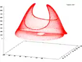 An example of chaotic behaviour is obtained for γ = 0.87 and α = 1.1 with initial conditions of (−1, 0, 0.5).[4] The correlation dimension was found to be 2.19 ± 0.01.[5] The Lyapunov exponents, λ are approximately 0.1981, 0, −0.6581 and the Kaplan–Yorke dimension, DKY ≈ 2.3010[4]