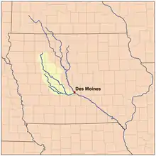 The Raccoon River is a 30.8-mile-long (49.6 km)[4] tributary of the Des Moines River in central Iowa in the United States. It flows for much of its length as three streams and when measured using the longest of its three forks, its length increases to 226 miles (364 km).[4]