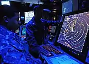 - Airport surveillance radar – In aviation, radar is the main tool of air traffic control. A rotating dish antenna sweeps a vertical fan-shaped beam of microwaves around the airspace and the radar set shows the location of aircraft as "blips" of light on a display called a radar screen. Airport radar operates at 2.7 – 2.9 GHz in the microwave S band. In large airports the radar image is displayed on multiple screens in an operations room called the TRACON (Terminal Radar Approach Control), where air traffic controllers direct the aircraft by radio to maintain safe aircraft separation.