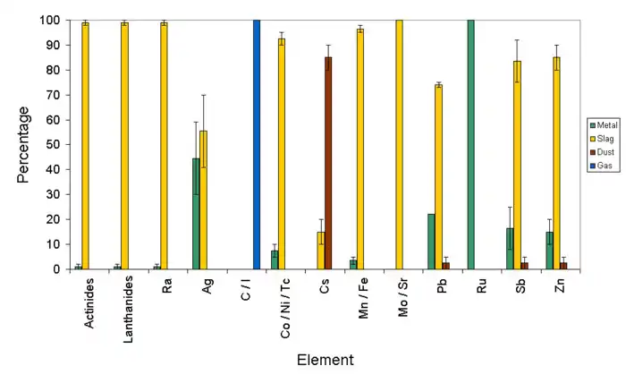 In the case of a caesium source being melted in an electric arc furnace used for steel scrap, it is more likely that the caesium will contaminate the fly ash or dust from the furnace, while radium is likely to stay in the ash or slag. The United States Environmental Protection Agency provide data about the fate of different contaminating elements in a scrap furnace.[22] Four different fates for the element exist: the element can stay in the metal (as with cobalt and ruthenium); the element can enter the slag (as in lanthanides, actinides and radium); the element can enter the furnace dust or fly ash (as with caesium), which accounts for around 5%; or the element can leave the furnace and pass through the bag house to enter the air (as with iodine).