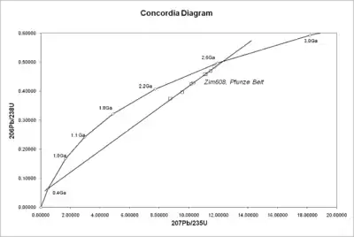 One of its great advantages is that any sample provides two clocks, one based on uranium-235's decay to lead-207 with a half-life of about 700 million years, and one based on uranium-238's decay to lead-206 with a half-life of about 4.5 billion years, providing a built-in crosscheck that allows accurate determination of the age of the sample even if some of the lead has been lost. This can be seen in the concordia diagram, where the samples plot along an errorchron (straight line) which intersects the concordia curve at the age of the sample.