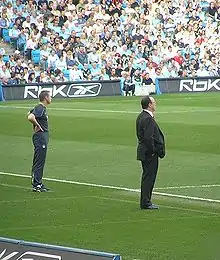 Liverpool made a good start to the 2007–08 season, topping the Premier League table for the first time under Benítez after a comprehensive 6–0 win over Derby County. Despite this, poor results in the Champions League and a disagreement over future transfers lead to a public falling-out with the club's owners, which played out in the media at the end of November. It was suggested that Benítez's position was now under serious threat. The resulting coverage resulted in a show of support by fans in support of Benítez which culminated in a fans' march in support of Benítez ahead of the critical Champions League home tie with Porto, which they won 4–1.[22] It later emerged that Jürgen Klinsmann had been offered Benítez's job before eventually accepting the post of Bayern Munich manager. Such a revelation damaged Benítez's relations with the Americans, with constant rumours linking the Spaniard with a move back to Real Madrid.[23] Benítez, however, said that his future was at Liverpool and signalled his long-term intentions by appointing Sammy Lee as his new assistant[24] to replace his long-time right-hand man, Pako Ayestarán, who quit after a reported disagreement, which Benítez admitted "hurt" him and arguably Liverpool's titles hopes.