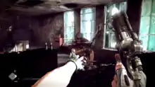 Combat is undertaken from a first-person perspective; the player is armed with a variety of upgradeable firearms, as well as a crossbow, and boomerang-like weapons called "wingsticks" which can be used for stealthy attacks. There are several types of ammunition available for each weapon, to allow the player to further customize their play style. As an example, the crossbow's primary ammunition is metal bolts, but it also can shoot electrified bolts, explosive bolts, and more. There are two standard varieties of enemies: enemies with firearms which will take cover and exchange fire with the player, and melee enemies that will charge the player and attack with melee weapons.