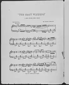 Some early piano rags are entitled marches, and "jig" and "rag" were used interchangeably in the mid-1890s.[17] Ragtime was also preceded by its close relative the cakewalk. In 1895, black entertainer Ernest Hogan composed two of the earliest sheet music rags, one of which ("All Coons Look Alike to Me") eventually sold a million copies. The other composition was called "La Pas Ma La", and it was also a hit.[19]