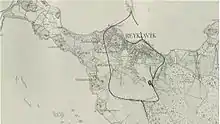 Probably the most well-known Icelandic rail project, the Reykjavík Harbour Railway, of 900 mm (2 ft 11 7⁄16 in) narrow gauge, operated from 1913 until 1928 for the construction of the harbour breakwaters. The railway operated from a quarry outside the city, Öskjuhlíð, from which it ran a short distance to a junction, passing loop, and sidings. This junction was located just south of a large field which became (and remains) the Reykjavík city airport. From here one line ran to the west, around the western edge of the city, before proceeding along the newly constructed western harbour pier to the island of Effersey. Here a headshunt allowed trains to reverse along a further line, built out onto the outer harbour wall, and extended as that wall itself grew longer. From the first junction a second line ran east around farms to a locomotive depot just outside the city and on to a further junction where a short branch line led into a secondary quarrying site (now in the heart of the capital's residential district) whilst the main line continued to a further junction on the edge of the docks. From here one line ran along the quayside (where one of the locomotives is today preserved on display) whilst the other ran out along the eastern harbour wall.[1]