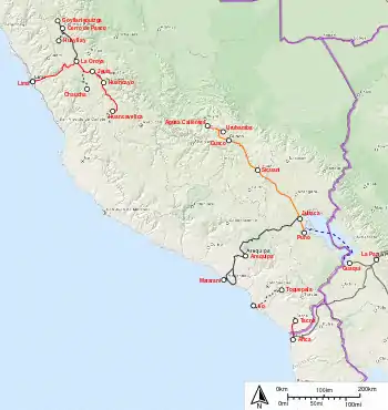 There were a number of other lines, all now closed, mostly for mineral or agricultural traffic, running inland from the coast north of Lima[20] and in Pisco Province.[5] There were also lines serving nitrate deposits in the Tarapacá Region, ceded to Chile in 1883.[5]