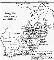 In the north, in the independent South African Republic, railway construction was done by the Netherlands-South African Railway Company (NZASM), which constructed two major lines: one from Pretoria to Lourenço Marques in Portuguese East Africa Colony, and a shorter line connecting Pretoria to Johannesburg. A national "link-up" was established in 1898, creating a national transport network.[4] This national network was largely completed by 1910.[1] Though railway lines were also being extended outside of South Africa, as far north as Northern Rhodesia (present-day Zambia),[5] the vision of Cecil John Rhodes, to have a rail system that would run from the "Cape to Cairo", would never materialise.