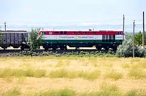 Rail transport in Tajikistan is limited, as the railroad system totals only 680 kilometres (420 mi) of non-electrified, single-track railway,[1] all of it 1,520 mm (4 ft 11 27⁄32 in) broad gauge. The system connects the main urban centres of western Tajikistan with points in neighboring Uzbekistan. In 1999 a new line connected the southern cities of Qurghonteppa and Kulob. In 2016, another line connected both cities to the capital Dushanbe, thus linking southern and central railway networks together.[2] The northern branch around Khujand remains physically disconnected from this main tajik railway network, accessible only through a lengthy transit via Uzbekistan. As of 2017, the passenger service remains limited to infrequent international trains from Dushanbe and Khujand to Moscow, one weekly train from Dushanbe to Khujand (via Uzbekistan) as well as a local service between Dushanbe and Pakhtaabad (daily) and Kulyob/Shahrtuz (twice weekly).