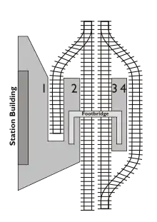 In US usage, this station would be described as having three platforms and four tracks (Tracks 1—4). In other English-speaking countries, it would be described as having four platforms (Platforms 1—4). | ||||||||||||||||||||||||||||||||||||||||||