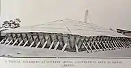 | The braced corrugated steel sides and roof of this grain storage in the 1930s, which prevent spoilage by pests, are common to present-day overflow grain storage. Click to enlarge. | This silo, one of two types at Minnipa, is typical of those built at the start of the bulk handling era in the 1950s. | The bulk handling complex at Ardrossan, on Yorke Peninsula, has several types of silo and shed storage; in the foreground are rows of overflow storage under tarpaulins. | The AusRail loader's introduction boosted the loading of wheat to 2000 tonnes per hour. |