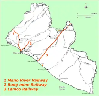 The 1,067 mm (3 ft 6 in) gauge Mano River railway primarily carried freight, but had a very limited passenger service between Monrovia, Mano River terminal, Brewerville, Klay, Tubmanburg, and Mano River Mine. These are now disused, due to exhaustion of the served Iron Ore deposits.[3]