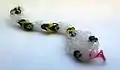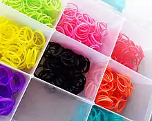 The Rainbow Loom is a plastic pegboard measuring 2 inches (51 mm) by 8 inches (200 mm).[2] It has push pin-type pegs over which small, colored rubber bands are looped and pulled by a rainbow loom crochet hook. The resulting looped knots, known as Brunnian links, can be assembled on the loom into bracelets and other shapes.[3] The Rainbow Loom kit includes the loom (the pegboard), a rainbow loom hook, 25 special C-shaped clips to connect both ends of the bracelet,[3] and 600+ small rubber bands in assorted colors.