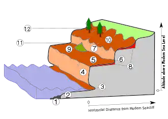 There are various methods for the direct dating of marine terraces and their related materials including 14C radiocarbon dating, which is the most common one.[36] E.g. this method has been used on the North Island of New Zealand to date several marine terraces.[37] It utilizes terrestrial biogenic materials in coastal sediments such as mollusc shells analyzing the 14C isotope.[24] In some cases dating based on the 230Th/234U ratio was applied though in case of detrital contamination or low uranium concentrations a high resolution dating was found to be difficult.[38] In a study in southern Italy paleomagnetism was used to carry out paleomagnetic datings[39] and luminescence dating (OSL) was used in different studies on the San Andreas Fault[40] and on the Quaternary Eupcheon Fault in South Korea.[41] In the last decennia, the dating of marine terraces has been enhanced since the arrival of terrestrial cosmogenic nuclides method, and particularly through the use of 10Be and 26Al cosmogenic isotopes produced in-situ.[42][43][44] These isotopes record the duration of surface exposure to cosmic rays.[45] and this exposure age reflects the age of abandonment of a marine terrace by the sea.