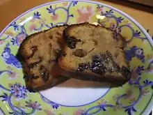 Boiled raisin cake is a type of raisin cake whereby various ingredients are first boiled, after which the batter is placed in cake pans then baked.[6][14] It is sometimes prepared with the omission of some standard cake ingredients, such as butter, eggs or milk.[15] Boiled raisin cake may have a moist consistency.[16] The cake dates back to the time of the American Civil War (1861–1865), when it was prepared in frontier areas using the Dutch oven.[17] Basic versions during this time were typically prepared using only raisins, sugar and a fat, such as vegetable shortening or lard.[17] Boiled raisin cake has been referred to as a type of war cake.[17][18]