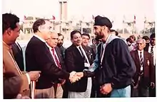 Rajiv Gandhi's first political tour was to England, where he attended the wedding ceremony of Prince Charles and Lady Diana Spencer on 29 July 1981.[18] In December the same year, he was put in charge of the Indian Youth Congress.[18] He first showed his organisational ability by "working round the clock" on the 1982 Asian Games. He was one of 33 members of the Indian parliament who were part of the Games' organising committee; sports historian Boria Majumdar writes that being "son of the prime minister he had a moral and unofficial authority" over the others.[19] The report submitted by the Asian Games committee mentions Gandhi's "drive, zeal and initiative" for the "outstanding success" of the games.[19]