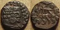 ![]() Northern Satrap Rajuvula. Obv. Bust of king and Greek legend BASILEOS BASILEON SOTEROS RAZU, "Saviour King of Kings, Rajuvula".[1][2] Rev. Athena Alkidemos and Kharoshthi legend Chatrapasa apratihatachakrasa rajuvulasa "the Satrap Rajuvula whose discus (cakra) is irresistible". These coins are found near Sankassa along the Ganges and in Eastern Punjab. Possibly minted in Sagala.[3] The coins are derived from the Indo-Greek types of Strato II.[3] | |