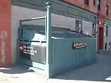 This station formerly had another entrance/exit to Howard Avenue and Fulton Street at the east (railroad south) end. The street stairs on the northwest side of the intersection, though closed, remain intact, but the street stairs on the southwest side of the intersection were sealed. Both platforms have one staircase to the closed-off portion of the mezzanine.[5]