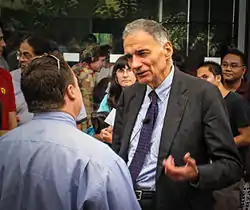 While campaigning at his alma mater Princeton University, Nader gave a lecture titled "The Corporate State and the Destruction of Democracy." He discussed the "political bigotry against third parties" and the lack of limitations on the power of corporations. Nader described his plans for reform, including single-payer national health insurance, cuts to the military budget, crackdowns on corporations, and a repeal of the 1947 Taft–Hartley Act.[18]