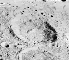 This is a worn crater, although the rim retains a generally circular character and is marked only by tiny craterlets (except for a notch in the south-southeast). The interior floor is relatively featureless, with a low central rise near the midpoint.