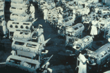 In 1915 superintendent William Ruddy Harriman was appointed and remained superintendent until 1952.[4] Under Harriman much of the farm was rebuilt following a flood in 1914 which brought with it significant improvements including new buildings and an irrigation system.[4] A multitude of new wards were also constructed to accommodate the rising number of mentally ill patients.[4] By 1922 the facility had fully transitioned from a poor farm to a medical facility although farming operations would continue on the grounds for a number of years after.[4] In 1926 the facility's occupational therapy program, which focused on rehabilitation through actions, was established and through it patients learned various crafts and made much the hospital's of the furniture, food, and other necessities.[4] In 1928 the auditorium was created in the place of the refectory.[4] By the end of the 1920s the facility had grown to 540 acres.[4] Following the stock market crash in 1929 the hospital received a cut in funding and an increase in residents. Despite the setbacks of the Great Depression the facility continued to expand and be upgraded including the 1933 addition of the first modern medical building, the Harriman building.[4] During this time the facility officially had its name changed from "The County Poor Farm" to "Rancho Los Amigos", which it is still known as today, to better reflect its position as a medical facility.[4] In 1933 the Long Beach earthquake brought with it more rebuilding and more improvements.[4] In 1935 The National Social Security Act enabled many older residents to leave Rancho Los Amigos which made room for many mentally ill children to be admitted in.[4] Due to many residents being unable to work this brought upon the end of Rancho Los Amigo's farming operations.[4] after World War 2 the facility's population doubled partially due to the 1944 polio outbreak.[4] Rancho Los Amigos became known for its polio care and in 1950 general ward 50 was remodeled to treat polio patients specifically.[4][5] In 1952 superintendent Harriman retired and was replaced by Robert Thomas.[4]