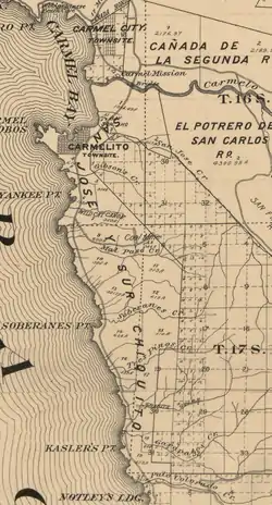 By 1890, Joseph Emory and Abner Bassett subdivided the land into 1,000 parcels. They begin selling lots for $25 to $50 to a new town they initially called Point Lobos City, but later renamed Carmelito.[6] The lack of a bridge across the Carmel River and two national economic recessions during the 1890s combined to severely restrict sales.[9][12] The outer portion of the point was reserved as the Point Lobos Park.[7]