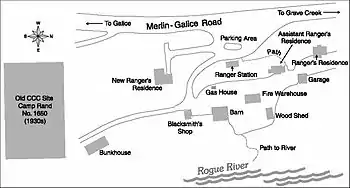 President Theodore Roosevelt created the Siskiyou National Forest in 1906. In 1909, six ranger districts were established to manage specific areas within the National Forest. The Galice Ranger District was responsible for Forest Service lands in the Rogue River canyon including timber sales, trail construction, and fire suppression activities. Jesse P. Dewitt became the first district ranger. Because the Forest Service had trouble securing permission to build a ranger's residence at the Rand site (which was owned by a local mining company), Dewitt was forced to live in a tent for eight years, from 1909 until 1916. In 1916, the mining company finally agreed to rent a small parcel of land to the Forest Service for one dollar per year. Construction on the ranger's residence, district office, and a barn began in 1917. In 1932, the Rand mining claim expired, and the Forest Service took permanent control of the ranger station property.[1][2]