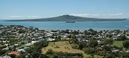 Rangitoto Island is a volcanic island in the Hauraki Gulf near Auckland, New Zealand. The 5.5 km (3.4 mi) wide island is a symmetrical shield volcano cone, reaching a height of 260 m (850 ft).[1][2] Rangitoto is the youngest and largest of the approximately 50 volcanoes of the Auckland volcanic field, having formed in an eruption about 600 years ago, and covering an area of 2,311 ha (5,710 acres).[2][3] It is separated from the mainland of Auckland's North Shore by the Rangitoto Channel. Since World War II, it has been linked by a causeway to the much older, non-volcanic Motutapu Island.[4]