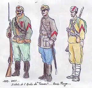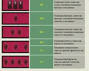 By order from April 25, 1918 of the "People's Commissar for Military and Naval Affairs" a temporary committee was established, to develop proposals pertaining to the uniform of the Red Guards.[3] In November 29, 1918 the All-Russian Central Executive Committee approved these proposals and agreed to the rank designations as follows to be used, by both the Red Guards and the Red Army's ground forces as a whole:[4]