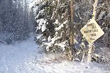 Ranney Hill is an easy drive from Yellowknife, NWT over two types of surfaces, chip seal and gravel. The short journey begins on the new bypass road that forms the beginning of the Ingraham Trail (Highway 4) accessible between Old Airport Rd. and the end of Highway 3. After driving approximately five minutes, the entrance to Vee Lake Road will be seen on the left. After another 10 minutes, the entrance to Ranney Hill will be seen on the left at the last sharp turn of the road before the boat launch, a few hundred meters further. There is no formal parking space at the entrance; visitors park along the widen road edge. Using the new what3words geocoding location tool, the entrance to the trail is found at sunglasses.untaxed.beasts.[6]