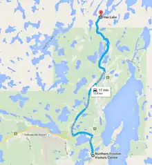 Ranney Hill is named after Winslow C. Ranney, a prospector and trapper who first came into the Yellowknife region in 1934. Numerous claims were staked in this area between 1935 and 1937 by Mr. Ranney. Development was undertaken by a small crew under Ranney’s supervision during 1937 and 1938, and apparently Ranney utilized a small milling unit to recover some gold from a short mine tunnel around 1939. Further exploration was conducted at this site during the 1940s by Ranney Gold Mines Limited, but no further mining development was undertaken. Ranney's now abandoned cabin, claim, and tunnel are between David Lake and Rater Lake — lakes seen in the first illustrative panorama below. In 1998, claims were staked in the area and some shallow x-ray diamond drilling was conducted on Ranney's main claim. The results of this work are unknown.[3] Presently, the Ranney Hill area is a favored hiking destination and is well-marked by ribbons from the Vee Lake Road.