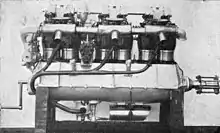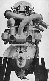 The engine had its cylinders arranged in pairs, with two separate steel cylinder liners screwed into the pairwise cast cylinder heads. The cylinder heads had integral cooling jackets and were cast from steel in pairs and then machined.[7][8] The valve seats, with the exhaust valve seats being water-cooled, were separately built parts which were screwed into the cylinder heads and could be easily removed for maintenance work. Both inlet valves of the cylinder pair, and likewise so both exhaust valves on the other side, were pressed into their seat by a single pivoted leaf spring each. The exhaust and inlet valves were actuated successively from a single cam on the overhead camshaft via roller tappets and rocker arms.[8]