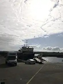 A ferry operated by Rathlin Island Ferry Ltd connects the main port of the island, Church Bay, with the mainland at Ballycastle, 6 miles (10 kilometres) away. Two ferries operate on the route – the fast foot-passenger-only catamaran ferry Rathlin Express and a purpose-built larger ferry, commissioned in May 2017, Spirit of Rathlin, which carries both foot passengers and a small number of vehicles, weather permitting.[6][7] Rathlin Island Ferry Ltd won a six-year contract for the service in 2008 providing it as a subsidised "lifeline" service.[8] There is an ongoing investigation on how the transfer was handled between the Environment Minister and the new owners.[9]