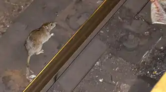 In 2014, New York City Councilman Mark D. Levine said at a public hearing that "We've had rats who are going into cars and eating out electrical cables. We have rats that are entering homes."[35] He described the problem as "epidemic" on some streets in Manhattan.[35] That year, YouTube videos of rats on subway tracks and in a subway car in New York City went viral, as did videos of rats in a Dunkin' Donuts in Manhattan.[36][37][38][39] In June 2014, residents at adjacent Upper West Side buildings started a rent strike, demanding an end to the rat problem.[40] Also in 2014, Allerton Coops in Bronx Park East received three Notices of Violation from the Health Department and was fined for their inadequate response to a severe rat infestation.[41][42][43]