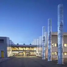 There is also a jogging track completely surrounding the building that connects with the wider network of cycling and jogging paths throughout Ravenscraig and beyond. A mobile tennis court has been added for indoor and outdoor use, the first of its type in the UK.[9]