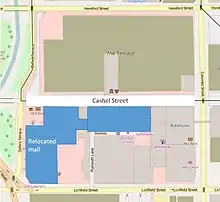 City Mall was the main shopping area in central Christchurch. The pedestrian mall was made up of two blocks of Cashel Street (from Oxford Terrace to High Street), and one block of High Street (from Cashel Street to Hereford Street). The central city including buildings in City Mall suffered some damage in the 4 September 2010 Canterbury earthquake. Although lower in magnitude, the 2010 Boxing Day earthquake was more damaging as the epicentre was directly located under the central city.[1] It was the 22 February 2011 Christchurch earthquake that all but devastated the city centre, when many of the building façades of the historic buildings in the mall collapsed.[2]