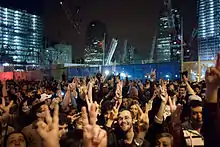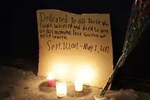 Even before the official announcement, crowds gathered spontaneously to celebrate outside the White House, where thousands assembled.[4] Hundreds of New Yorkers also gathered in Times Square and at Ground Zero, the site of the terrorist attacks of September 11, 2001.[5] In Dearborn, Michigan, a suburb of Detroit with a large Muslim and Arab population, a small crowd gathered outside the City Hall in celebration, many of them of Middle Eastern descent.[6] From the beginning to the end of Obama's speech, 4,000 tweets were sent per second on Twitter.[7]