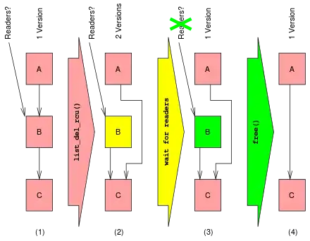 - sleep until the operating system kernel determines that there are no readers left using the old structure, for example, in the Linux kernel, by using synchronize_rcu().