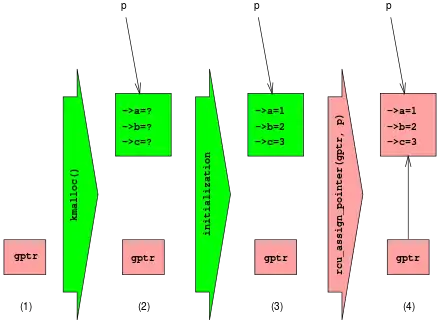 The first state shows a global pointer named gptr that is initially NULL, colored red to indicate that it might be accessed by a reader at any time, thus requiring updaters to take care. Allocating memory for a new structure transitions to the second state. This structure has indeterminate state (indicated by the question marks) but is inaccessible to readers (indicated by the green color). Because the structure is inaccessible to readers, the updater may carry out any desired operation without fear of disrupting concurrent readers. Initializing this new structure transitions to the third state, which shows the initialized values of the structure's fields. Assigning a reference to this new structure to gptr transitions to the fourth and final state. In this state, the structure is accessible to readers, and is therefore colored red. The rcu_assign_pointer primitive is used to carry out this assignment, and ensures that the assignment is atomic in the sense that concurrent readers will either see a NULL pointer or a valid pointer to the new structure, but not some mash-up of the two values. Additional properties of rcu_assign_pointer are described later in this article.