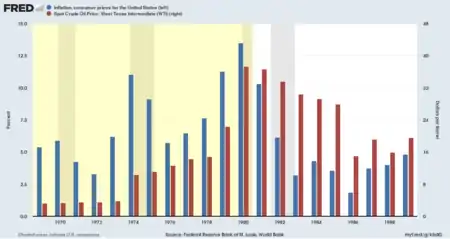 Some economists have stated that Reagan's policies were an important part of bringing about the third longest peacetime economic expansion in U.S. history.[38][39] During the Reagan administration, real GDP growth averaged 3.5%, compared to 2.9% during the preceding eight years.[40] The annual average unemployment rate declined by 1.7 percentage points, from 7.2% in 1980 to 5.5% in 1988, after it had increased by 1.6 percentage points over the preceding eight years.[41][42] Nonfarm employment increased by 16.1 million during Reagan's presidency, compared to 15.4 million during the preceding eight years,[43] while manufacturing employment declined by 582,000 after rising 363,000 during the preceding eight years.[44] Reagan's administration is the only one not to have raised the minimum wage.[45] The inflation rate, 13.5% in 1980, fell to 4.1% in 1988, in part because the Federal Reserve increased interest rates (prime rate peaking at 20.5% in August 1981[46]).[47][48] The latter contributed to a recession from July 1981 to November 1982 during which unemployment rose to 9.7% and GDP fell by 1.9%. Additionally, income growth slowed for middle- and lower-class (2.4% to 1.8%) and rose for the upper-class (2.2% to 4.83%).[49]