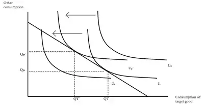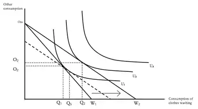 For cost reducing resource efficiency, distinguishing between direct and indirect effects is shown in Figure 1 below. The horizontal axis shows units of consumption of the targets good (which could be for example clothes washing, and measured in terms of kilograms of clean clothes) with consumption of all other goods and services on the vertical axis. An economical technology change that enables each unit of washing to be produced with less electricity results in a reduction of the price per unit of washing. This shifts the household budget line rightwards. The result is a substitution effect because of the decreased relative price, but also an income effect due to the increased real income. The substitution effect increases consumption of washing from Q1 to QS, and the income effect from QS to Q2. The total increase in consumption of washing from Q1 to Q2 and the resulting increase in electricity consumption is the direct effect. The indirect effect comprises the increase in other consumption, from O1 to O2. The scale of each of these effects depends on the elasticity of demand for each of the goods, and the embodied resource or externality associated with each good. Indirect effects are difficult to measure empirically.[12] In the manufacturing sector, it has been estimated that there is about a 24% rebound effect due to increases in fuel efficiency.[12] A parallel effect will happen for cost saving efficient technologies for producers, where output and substitution effects will occur.