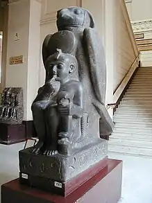 Some linguists believe that the Chinese developed their writing system according to the rebus principle,[9] and Egyptian hieroglyphs sometimes used a similar system. A famous rebus statue of Ramses II uses three hieroglyphs to compose his name: Horus (as Ra), for Ra; the child, mes; and the sedge plant (stalk held in left hand), su; the name Ra-mes-su is then formed.[10]