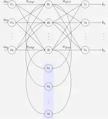 An Elman network is a three-layer network (arranged horizontally as x, y, and z in the illustration) with the addition of a set of context units (u in the illustration). The middle (hidden) layer is connected to these context units fixed with a weight of one.[23] At each time step, the input is fed forward and a learning rule is applied. The fixed back-connections save a copy of the previous values of the hidden units in the context units (since they propagate over the connections before the learning rule is applied). Thus the network can maintain a sort of state, allowing it to perform such tasks as sequence-prediction that are beyond the power of a standard multilayer perceptron.