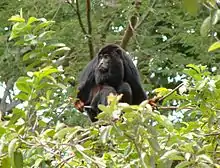 When not foraging, red-handed howlers rest in the canopy of mature trees 20 m (66 ft) from the forest floor.[8] They also live in social groups of seven to 12 members, with one or two mature males, females, juveniles, and infants.[9]