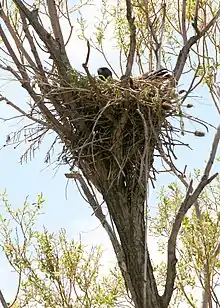 The pair constructs a stick nest most often in a large tree 4 to 21 m (13 to 69 ft) off the ground. They may too nest on virtually any man-made structures with some variety of ample ledges or surface space and good views of the surrounding environment (i.e. powerline poles, radio transmission towers, skyscraper buildings).[9][5][61][264][265][266] Much variation is recorded in nest usage behavior, many red-tails build new nests every year despite prior nests sometimes being in good standing and unoccupied, some may reuse a nest in subsequent years or may leave a nest for a year and then come back to it the following year.[9][5] A red-tailed hawk nest is typically located in a gradient zone between woods with tall, mature trees, if available, and openings whether this is composed of shrubland, grassland or agricultural areas.[267] Nest sites vary greatly in topography and vegetative composition.[268] While tree nests are largely preferred, occasionally the species nests on cliff ledges may be utilized even where other nest sites are presumably available. Cliff nests may be located at 35 m (115 ft) or higher above the nearest flat ground.[5][269][270] At times, unlike great horned owls, red-tailed hawks have been recorded nesting in surprisingly unbroken forests.[271] In North Dakota, nest sites tend to be concentrated along wooded river drainages.[272] Compared to Swainson's hawks and ferruginous hawks, red-tailed hawk nests are usually in taller trees and are closer to waterways.[8][273] In Puerto Rico, nests are most often found in transitional zone between dry lowlands and mountainous cloud forests, with trees typically taller than their neighbors to allow views of more than half of their home ranges. More than 21 tree species were recorded used in Puerto Rico.[99] Tree species is seemingly unimportant to red-tailed hawks.[274] In some parts of Arizona, saguaro cactus were used exclusively as nesting sites.[213] Alternately, old nests of other Buteo hawks, corvids, golden eagles and even leaf nests of tree squirrels have also been used by red-tailed hawks.[2] Both members of the pair will build the nests but the female spends more time forming the bowl, with the greatest activity often in the morning and nest building completed in a week or less.[83][118] The nest is generally 71 to 97 cm (28 to 38 in) in diameter, with a mean of roughly 76 cm (30 in), and can be up to 96 cm (38 in) tall after several years use. The inner bowl averages about 37 cm (15 in) wide and 13 cm (5.1 in) deep.[9][64][231] The nest is constructed of twigs, and lined with bark, pine needles, corn cobs, husks, stalks, aspen catkins, or other plant lining matter. Lining the nest may be for warning other red-tails of the active use of a nest.[9][83] In moderate to northern climes, red-tailed hawks tend to face to the south or west, presumably to make them less vulnerable to strong northeasterly storm winds.[275]