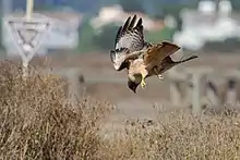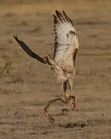 The most common flighted hunting method for red-tail is to cruise approximately 10 to 50 m (33 to 164 ft) over the ground with flap-and-glide type flight, interspersed occasionally with harrier-like quarters over the ground. This method is less successful than perch hunting but seems relatively useful for capturing small birds and may be show the best results while hunting in hilly country.[2][5][27] Hunting red-tailed hawks readily will use trees, bushes or rocks for concealment before making a surprise attack, even showing a partial ability to dodge among trees in an Accipiter-like fashion. Among thick stands of spruce in Alaska, a dodging hunting flight was thought to be unusually important to red-tails living in extensive areas of conifers, with hawks even coming to the ground and walking hurriedly in prey pursuit especially if the prey was large, a similar behavior to goshawks.[5][76] Additional surprisingly swift aerial hunting has reported in red-tails who habitually hunt bats in Texas. Here the bat-hunting specialists would stoop with half-close wings, quite falcon-like, plowing through the huge stream of bats exiting their cave roosts, then zooming upwards with a bat in its talons. These hawks would also fly parallel closely to the stream, then veer sharply into it and seize a bat.[96][97][98] In the neotropics, red-tails have shown the ability to dodge amongst forest canopy whilst hunting.[2][99] In Kansas, red-tailed hawks were recorded sailing to catch flying insects, a hunting method more typical of a Swainson's hawk.[100] Alternately, they may drop to the ground to forage for insects like grasshoppers and beetles as well as other invertebrates and probably amphibians and fish (except by water in the latter cases). Hunting afoot seems to be particularly prevalent among immatures. Young red-tailed hawks in northeastern Florida were recorded often extracting earthworms from near the surface of the ground and some had a crop full of earthworms after rains. Ground hunting is also quite common on Socorro Island, where there are no native land mammals and invertebrates are more significant to their overall diet.[2][5][101] A red-tailed hawk was observed to incorporate an unconventional killing method which was drowning a heron immediately after capture.[102] One red-tailed hawk was seen to try to grab a young ground squirrel and, upon missing it, screamed loudly, which in turn caused another young squirrel to break into a run wherein it was captured. Whether this was an intentional hunting technique needs investigation.[27] Upon capture, smaller prey is taken to a feeding perch, which is almost always lower than a hunting perch. Among small prey, rodents are often swallowed whole as are shrews and small snakes, while birds are plucked and beheaded. Even prey as small as chipmunks may take two to three bites to consume. Larger mammals of transportable size are at times beheaded and have part of their fur discarded, then leftovers are either stored in a tree or fall to the ground. Large prey, especially if too heavy to transport on the wing, is often dragged to a secluded spot and dismantled in various ways. If they can successfully carry what remains to a low perch, they tend to feed until full and then discard the rest.[5][4][27]